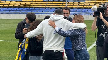 El ex Benfica, Real Madrid y PSG, entre otros equipos, cruzó el túnel de ingreso al campo de juego con la camiseta auriazul en una de sus manos. Con una sonrisa de oreja a oreja, la misma que tenían Jorgelina, con quien se fundió en un abrazo interminable, y las nenas, fueron casi hasta el círculo central y posaron para los fotógrafos.