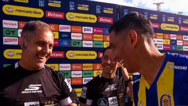 Ángel Di María y el árbitro Fernando Echenique protagonizaron un momento muy divertido durante el sorteo previo al inicio del partido entre Central y Gimnasia por la séptima fecha del Torneo Apertura 2026, este miércoles a la tarde en La Plata.