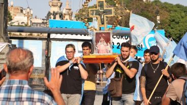 “¡A cantar! ¡A cantar!", levanta el sacerdote. Y los pañuelos celestes se agitan.