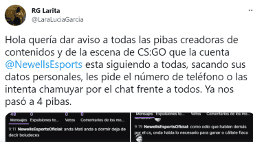 "Quería dar aviso a todas las pibas creadoras de contenidos y de la escena de CS:GO que la cuenta @NewellsEsports está siguiendo a todas, sacando sus datos personales, les pide el número de teléfono o las intenta chamuyar por el chat frente a todos", escribió Lara García este martes por la mañana en su perfil de Twitter, denunciando que por lo menos cuatro chicas habían recibido mensajes de este tipo.