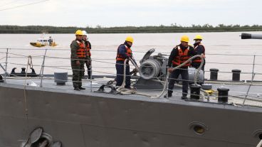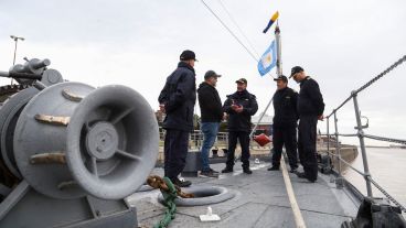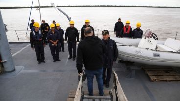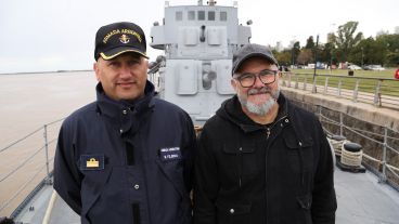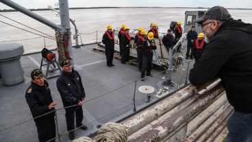 Fernando fue el primero en subir y ser saludado por los altos mandos del buque (ver fotogalería): el capitán Sergio Tejeda (quien escuchó la historia del cabo Gallo en el podcast de Rosario3 y hoy conoció a Vitale), el comandante del King Diego Lomo y contraalmirante Claudio Gardenal, titular del Área Naval Fluvial; los tres rosarinos que activaron el "protocolo de funeral de honor".