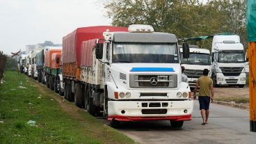 Una larga fila de camiones había este jueves a la mañana en avenida 27 de Febrero y Circunvalación, a la espera de poder descargar en Puerto Rosario. Muchos transportistas habían pasado la noche en sus cabinas, con condiciones precarias y con temor a sufrir robos.