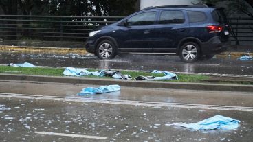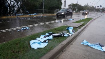 Allí, en la fachada del Museo de Arte Contemporáneo, se realizaba una intervención impulsada por el Banco de Alimentos Rosario (BAR), colocando en el frente las fotografías de las personas que colaboran con esta organización. El tema es que la lluvia sorprendió a los intervencionistas y cientos de fotos quedaron arruinadas en el piso.