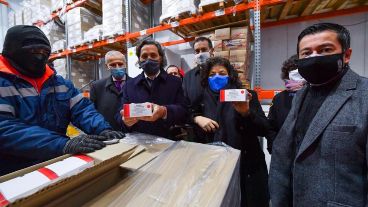 El jefe de Gabinete de Ministros de la Nación, Santiago Cafiero, y la ministra de Salud, Carla Vizzotti, recibieron formalmente este jueves por la mañana las primeras vacunas Sputnik V elaboradas por el Laboratorio Richmond, en la Planta de Operaciones de Logística Farmacéutica de la empresa Andreani, ubicada en el partido bonaerense de Malvinas Argentinas.