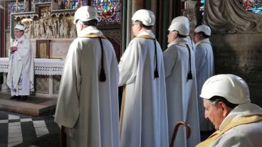 Dos meses después de ser devastada por el fuego, Notre Dame acogió este sábado su primera misa en condiciones aún muy precarias, que obligaron a la treintena de participantes a llevar cascos de obra por el riesgo de desprendimientos.