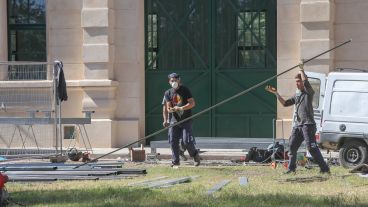 Cinco empleados municipales preparan las camas en uno de los tres pabellones de la Ex Sociedad Rural habilitados como centro de aislamiento para pacientes leves de coronavirus en Rosario. Cada uno tiene un barbijo de distinto color: el de rojo junta sábanas, otro con uno azul revisa los colchones y una mujer con uno claro, tipo descartable, anota algo. Afuera, tres operarios del área de Talleres centrales colocan con un andamio unas chapas sobre las arcas o ventanales que evitan que las palomas se metan dentro del pabellón con la inscripción “1923” en el frente.