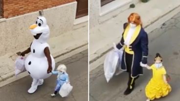 Jaime Coronel, de 34 años, aprovechó el comienzo confinamiento para limpiar y ordenar trastos cuando, entre las cajas, encontró su disfraz de Olaf y el de Elsa de su hija Mara, por lo que ambos se los pusieron y jugaron con ellos y luego salieron así a tirar la basura. Sucedió en Puertollano, Ciudad Real, España.