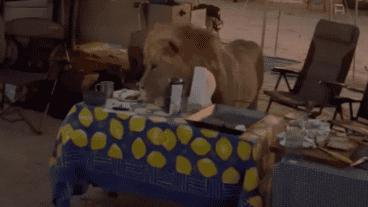 En un momento del encuentro el felino accidentalmente tira una botella de la mesa y hace que golpee ruidosamente en el suelo, aparentemente rompiendo su percepción como un cazador sigiloso. El clip concluye con el león lanzando una mirada escalofriante antes de desaparecer en la naturaleza.