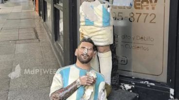 La escultura de Lionel Messi que se encuentra en la intersección de Moreno y Santa Fe, en pleno centro marplatense, volvió a ser blanco de actos vandálicos durante la madrugada. El monumento, que muestra al capitán de la selección argentina alzando la Copa del Mundo, apareció con las piernas arrancadas y claros daños por golpes, completamente destruido frente al local gastronómico El Nuevo Mundial.