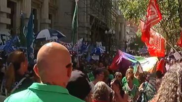 En el primer día de la segunda semana del paro docente,los maestros se movilizaron en la plaza San Martín frente a la sede de Gobierno de Rosario para reclamar una mejora salarial y seguridad en las escuelas. En paralelo, la provincia convocó a una reunión paritaria para este jueves.