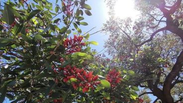 La primavera estalló en rojo, con las flores del ceibo abiertas al sol. Este lunes aclara temprano, con un cielo celeste que al parecer cruzarán las nubes. Tibieza en el aire.