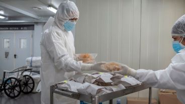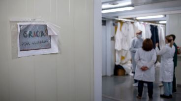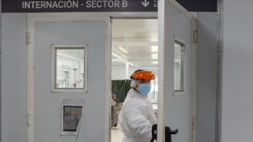 El “Hospital modular en red Granadero Baigorria” construido por el gobierno nacional es una combinación de contenedores y sistemas de aire con filtros para limpiar partículas, oxígeno general y camas con o sin respirador. El ingreso tiene una sala donde los profesionales se ponen y sacan los equipos de protección y los desinfectan. Una bata o un mameluco, guantes dobles, un barbijo arriba de otro y ambos debajo de una escafandra que se completa con cofias para el pelo y botas para las zapatillas. Enumerarlo agota. Ponerlo y sacarlo, cada vez, cada día, más.