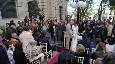 No fue un casamiento más. Este viernes al mediodía, en el coqueto pasaje Luetich de Rosario, se casaron el intendente de la ciudad, Pablo Javkin, y la médica Luisina Fruci. Hubo muchos invitados por la pareja, personalidades muy conocidas de Rosario y también muchos curiosos y curiosas que se acercaron a ese lugar tan característico para "chusmear" lo que allí pasaba.