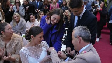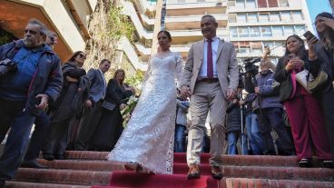 Al rato llegó la novia, de sencillo y a la vez distinguido vestido blanco con encajes, que también habló para los medios presentes: "No soy de hablar mucho, me cuesta bastante, pero estoy muy feliz por este momento que estamos compartiendo con Pablo", dijo. Y agregó: "Somos dos personas muy trabajadoras y muy intensas, por eso quizás se dio la atracción entre ambos".
