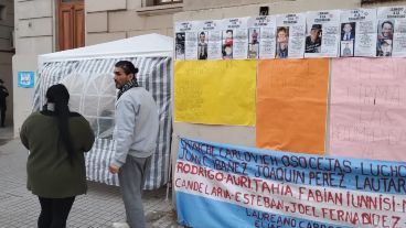 Una carpa de grandes dimensiones fue montada en calle Moreno, frente al acceso al edificio que es sede del gobierno provincial en Rosario. Son familiares de 8 personas que fueron asesinadas en distintos hechos de violencia: Damián Lucero, Joaquín Pérez, Lautaro Aranda, Nicolas Aguero, Matías Ibañez, Candelaria Enrique, Mauro Villamil e Ivana Garcilazo. Sus fotos empapelan el lugar.