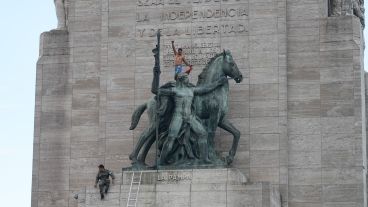El hombre se ubicó sobre la cabeza del caballo en el grupo de esculturas de La Pampa, en uno de los laterales del Monumento obra de Alfredo Bigatti.