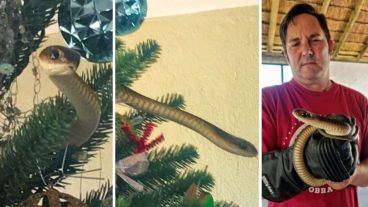 Una familia se espantó al encontrar una serpiente venenosa acechando dentro del árbol de Navidad. Rob y MarcelaWild notaron al animal escondido entre el oropel y las chucherías. Sucedió en Sudáfrica.