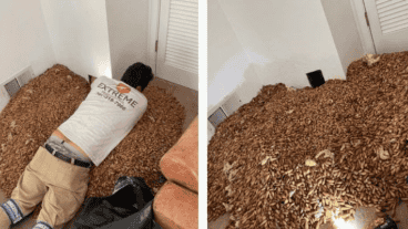 Asumió que un animal debió encontrar su camino hacia su pared y murió adentro, y llamó a un profesional para pedir su opinión. Cuando Nick llegó a la casa, hizo un pequeño agujero en la pared de la habitación del segundo piso y se quedó atónito cuando decenas de miles de bellotas salieron por la abertura.
