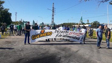 Durante la manifestación, en reclamo de sus puestos de trabajo, los cesanteados se encadenaron con alambres de púas y cadenas a la puerta de planta.