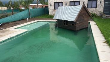 Se trata de una casita de juego de niños, pero de dimensiones considerables. Lo curioso es que cayó "parada" en el interior de la piscina y sin daños graves.