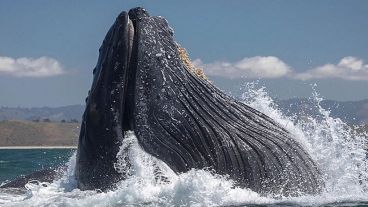 El fotógrafo estadounidense Chase Dekker captó con su lente el impactante momento en que una ballena jorobada emerge a la superficie marina y captura a un león marino entre sus fauces.