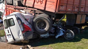 El choque se dio pasadas las 10.30 de la mañana en la mano que llega a Rosario a la altura del barrio Las Flores. Tanto el utilitario como el camión con acoplado circulaban en la misma dirección y, por razones que aún no están claras, colisionaron entre sí y terminaron volcando sobre el cantero que separa un carril del otro.
