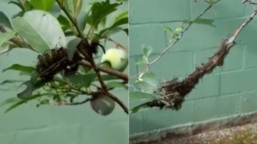 Los videos fueron registrados por el dueño de una casa de Zavalla. En la rama de un árbol, se acumularon varias orugas, seguramente en busca de alimento.