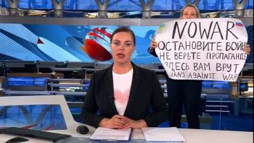 Una mujer irrumpió en el noticiero más visto de Rusia este lunes para protestar contra la invasión a Ucrania. Lo hizo mientras la conductora Ekaterina Andreieva del programa Vremia (El tiempo) de la cadena Pervy Kanal, estaba al aire. "No a la guerra. No se crean la propaganda. Les están mintiendo", rezaba sus pancartas.