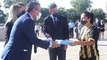 En este marco, y replicando la donación aludida, durante la ceremonia el intendente hizo entrega de banderas a seis clubes de distintos barrios de la ciudad, las que fueron recibidas por niñas, niños y jóvenes que asisten y practican deportes en esas instituciones. Se trata de Club Infantil de Fútbol General San Martín, barrio Fisherton; Club Atlético Deportivo Reflejos, barrio Empalme Graneros; Club del Ateneo Pablo Sexto, barrio Triángulo y Moderno; Club Alianza Sport, barrio Flammarión; Club Sportivo Servando Bayo, barrio Remeros de Escalada San Martín (más conocido como Echesortu), y Club Infantil Vicente López, barrio Sindicato de la Carne.