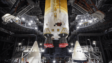 La etapa central del SLS, de 65 metros de altura, se unió a los propulsores laterales del vehículo dentro del Edificio de Ensamblaje de Vehículos en el Centro Espacial Kennedy. Los cohetes propulsores sólidos del SLS son responsables de impulsar el vehículo durante la primera etapa del lanzamiento.