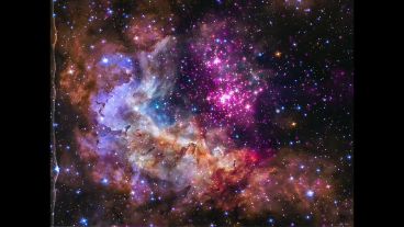 Este es un cúmulo de estrellas jóvenes, de entre uno y dos millones de años, ubicado a unos 20 mil años luz de la Tierra. En su forma de imagen visual, los datos del Hubble (verde y azul) revelan nubes gruesas donde se forman las estrellas, mientras que los rayos X vistos desde Chandra (púrpura) penetran a través de esa neblina.