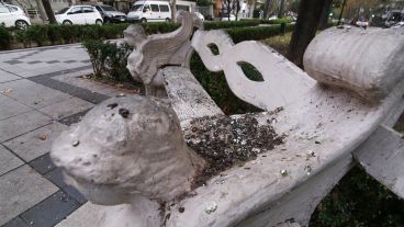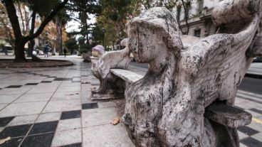 En los canteros de donde emergen las icónicas palmeras reina la tierra seca desnuda de todo verde. El césped solo crece en algunas zonas, como por casualidad. Algunos de los bancos se ven roídos y despintados, lo mismo el suelo, en muchas partes totalmente atacado por los desperdicios de palomas.