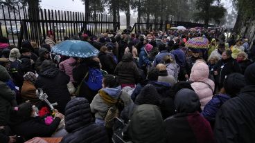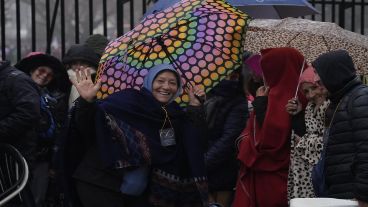 El lugar se había convertido en un “mar de paraguas” con la concurrencia de vendedores ambulantes que ofrecían café caliente para entibiar la espera. A las 8 estaba prevista la apertura de las puertas, y a las 11, la celebración de la misa. La prédica es a las 12 y quince minutos después, comienza la canción cantada de Leda.