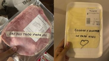 “Estoy aislada y mi viejo me dejó las compras”, contó Lai. “Lai sos todo para mi” y “comeme y acordate de papá Hugo” fueron de la mano, con el jamón y el queso.