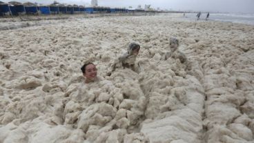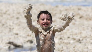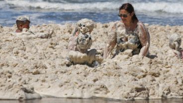 Los turistas aprovecharon los distintos balnearios y se sacaron fotos jugando con la espuma, que en algunos sectores cubrió la totalidad de la orilla, en un día nublado y con lloviznas pasajeras.