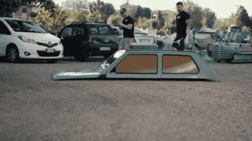 El modelo está basado en un Fiat Panda retro, que Matteo y Nicola cortaron a la mitad, dejando nada más que el capó, las ventanas, el parabrisas y el techo. Además debajo del nuevo marco, instalaron un juego de ruedas diminutas que son prácticamente invisibles a simple vista y las ventanas recién oscurecidas esconden un chasis de mini -kart que ha sido soldado al interior de la cabina.