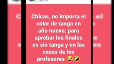 Un profesor correntino hizo una publicación en su cuenta de Facebook que rápidamente se viralizó y motivó la denuncia de diferentes organizaciones feministas. El docente escribió: “Para aprobar los finales es sin tanga y en la casa de los profesores”. Luego del escrache, intentó defenderse diciendo que "fue un chiste".