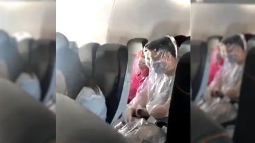 Las imágenes fueron tomadas por otra pasajera y muestran a la pareja protegida con una capa de plástico con capucha, así como con mascarillas y guantes quirúrgicos.