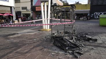 La casilla de venta de tarjetas magnéticas de transporte ubicada en San Luis y Barón de Maua fue incendiada este domingo a la noche y quedó destruida, a pesar de la intervención de los bomberos. No funcionaba desde la pandemia.