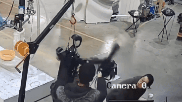 Los trabajadores se ve como al notar la situación intentan evitar ser golpeados por el robot, que cae al suelo y continúa su alboroto cibernético.