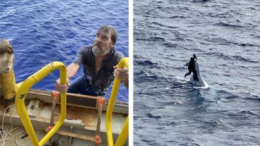 En las imágenes difundidas por la Guardia Costera, se puede ver a Bee nadando hacia una boya salvavidas naranja y subiendo a bordo del barco.