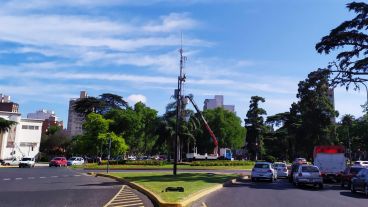 Este martes por la mañana, los que transitaban por ese lugar tan emblemático y bonito de Rosario, se sorprendieron al observar a empleados municipales subidos a una grúa, colocando la estrella mayor del arbolito. Y también tensando los cables para la posterior instalación de las bombillas.