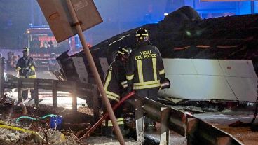 Sobre las 22 hora local, "los bomberos trabajaban junto a los restos del autobús carbonizado, volteado sobre el techo", constató un fotógrafo de la agencia de noticias AFP en el lugar del accidente, "entre Mestre y Marghera".
