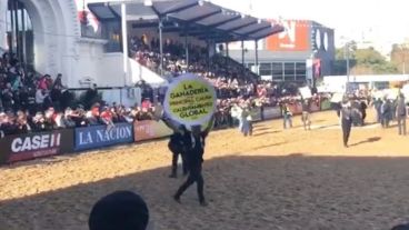 “Nos encantaría no tener que hacer estas activaciones pero lamentablemente por la emergencia climática, la contaminación y el maltrato extremo a los animales, a veces no nos queda otro tipo de acciones como esta. No nos gusta hacerlas y pedimos disculpas a la Sociedad Rural y a las personas presentes, pero es la única forma de que este mensaje llegue”, señaló Güerzoni.