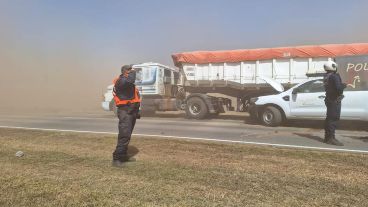Casi en paralelo, pasado el mediodía de este lunes, la tormenta de viento y tierra que se registra en la región provocó un impresionante choque múltiple en la autopista Rosario-Córdoba, a la altura de San Jerónimo Sud.