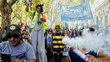 El frente de esa columna con fuerzas y sindicatos de izquierda, como el Polo Obrero, Amsafé Rosario, ATE e investigadores del Conicet, arroja una imagen que sintetiza la diversidad de los sectores que salieron a frenar las reformas impulsadas por el gobierno de Javier Milei, el mega DNU y la ley Ómnibus. Un joven disfrazado de abeja y un payaso en zancos secundan a docentes con pecheras que en las esquinas ordenan el tránsito.