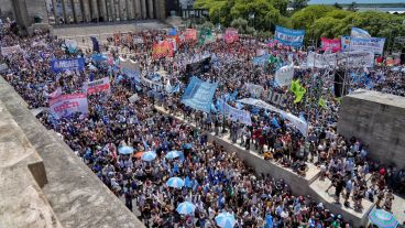 La multitud cae por Córdoba, se estira por la proa del Monumento y avenida Belgrano. Adentro, en las escalinatas que miran a la torre, se produce el acto de un sector de la CGT (Uocra, Carne, Obras Sanitarias, Uatre y otros). Estiman que hay 80 mil personas.