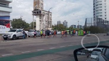 Un grupo de miltantes de la Federación de Organizaciones de base (FOB) realizaba una protesta en la zona de acceso a las torres Nordlink, en Puerto Norte, e impedían la entrada y la salida de las personas que trabajan allí.