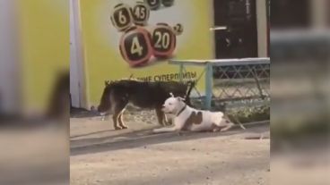 En Stávropol, Rusia, un perro callejero “libera” a otra can que estaba atado a un poste e intenta llevárselo de paseo.