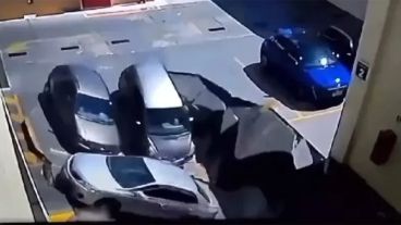 En las imágenes registradas por las cámaras de seguridad se puede ver que hay cuatro autos estacionados, pero había tres en un mismo sector. En un momento, parece moverse el piso y luego se traga a los autos que estaban parados.